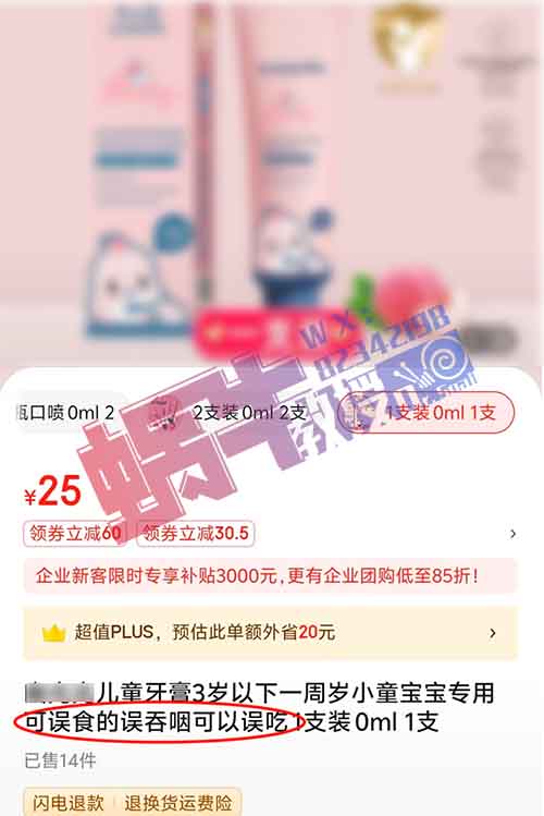 尊敬的领导您好 我在京东上买了一支儿童牙膏 我买的时候他说的是食用级可吞咽牙膏 然后到货后我朋友说我这个牙膏是不能吞咽的 自己也去查了一下 他这个是违法的还好我朋友给我说了不然我孩子要是不小心吞了那该咋办 希望领导明察秋毫 严肃处理 现诉求1.商家停止这种不诚信经营的方式 整改问题 2.按消费者权益保护法第55条处理退一赔三不满500按500! 谢谢领导!