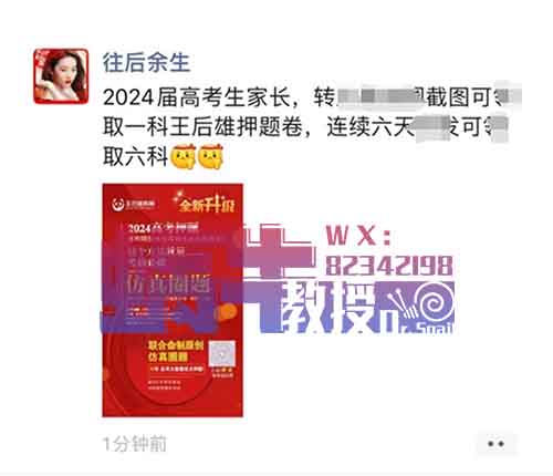 这张图是有一个人发了这样的一条状态,大概的意思,就是2024年的高考学生的家长要注意了,如果你帮我转一下这个,我就给你一科押题卷。转一次给一科···