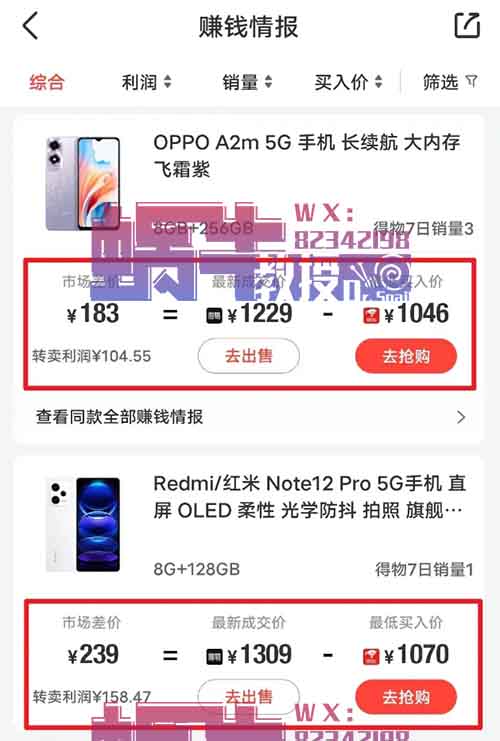 比如下面这款oppo手机,在得物上是1299元,而在京东的价格是1046元,差价是183元,转卖可赚104.55元,这个利润非常可观。