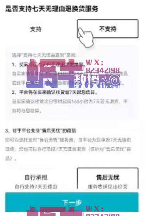 在填写收货地址的时候,系统会问你是否“支持七天无理由退换服务”记得要选择“不支持”然后勾选“售后无忧”