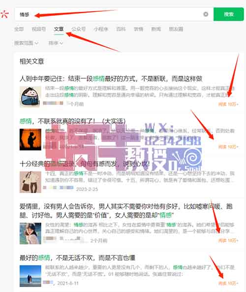 搜索出来之后我们点击文章,如图,我们可以看到有很多情感类的文章,然后我们选择阅读量有10万+的文章点击进去,然后我们将整篇文章复制下来。