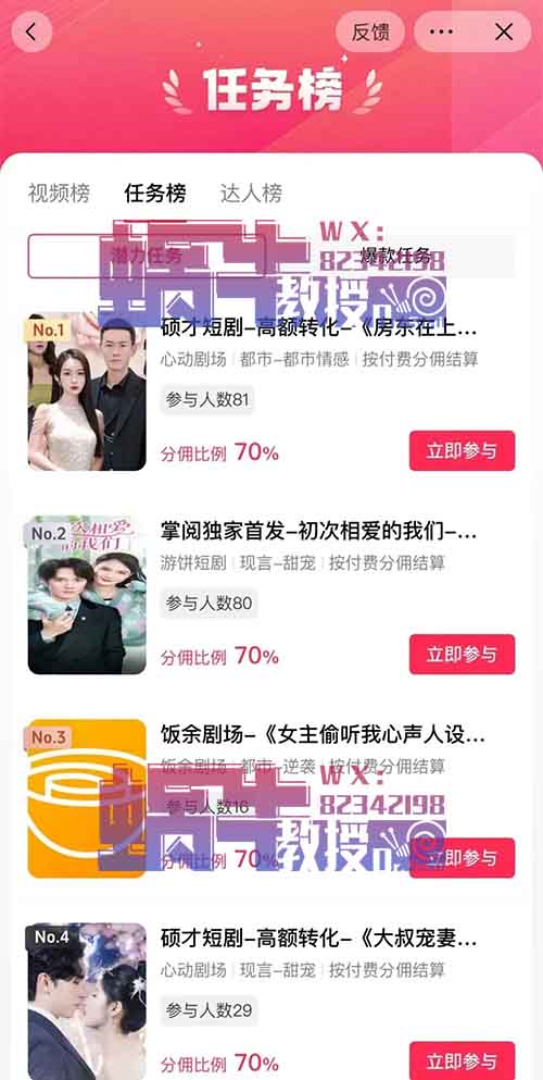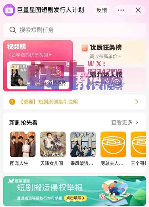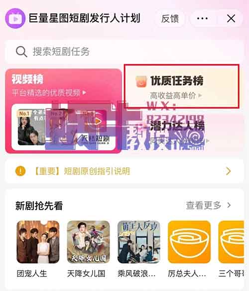 在里面选择“优质任务榜”的高佣金短剧进行剪辑创作,