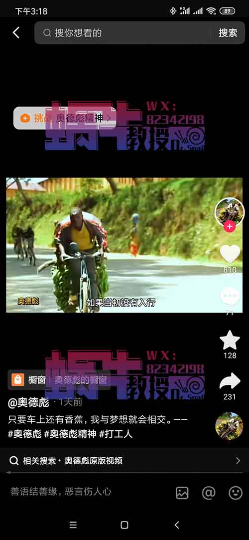 德彪经典语录类的视频都很容易火,现在流量非常大,语录和奥德彪生活紧密相关,香蕉与自行车充满了象征意味,语录让底层普通人深有感触,跟现实生活有着很大的关联性,容易引起共鸣,因为在社会上打拼,从来就没有容易二字。