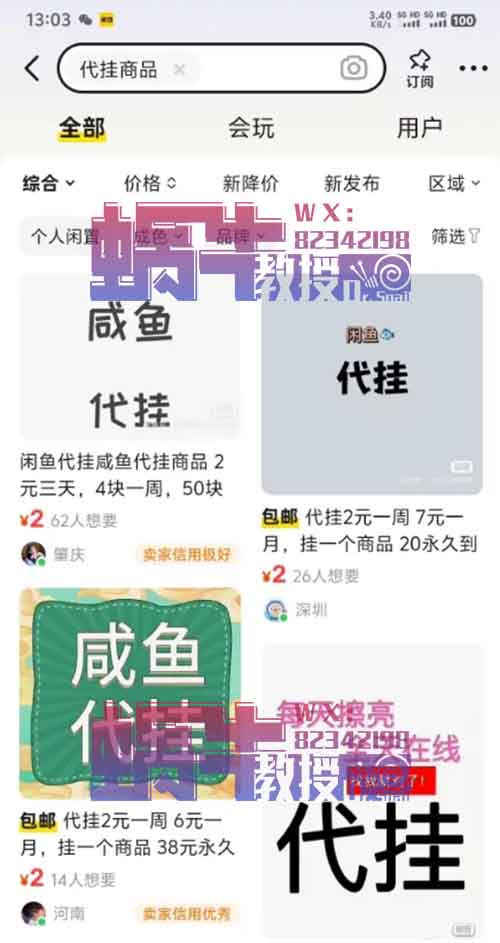 我们打开闲鱼看看,搜索“代挂商品”就可以看到很多商品信息。