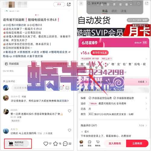 玩法也很简单粗暴没有那么多的弯弯道道,笔记直接展示低价购买的截图页面发布即可,像上面这种,笔记下面全部是需要低价开通会员的,一单的利润在3.5-10块,别看单价低但它需求高复购强,当你有几千的私域意向客户时,一个月啥都不干都能有大几千的收入。