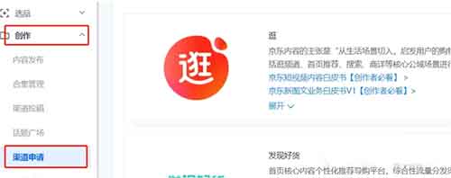 接下来,你需要进入京东创作服务平台界面申请创作权限。按照流程依次点击“创作”-“渠道申请”-“逛”即可。