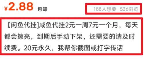 在闲鱼平台上,你会发现代挂服务的浏览量和需求量极为可观。价格亲民,仅需2元就能享受一周的代挂服务,7元更是能享受整月的专业服务。