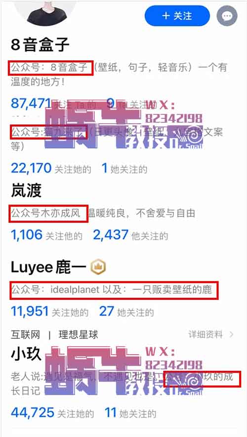 我找了5个在知乎上推广壁纸的账号,他们公众号首条阅读量少则几百,多则几千,名字分别为:8音盒子、猫九来了、木亦成风、一只贩卖壁纸的鹿和小玖的成长日记。