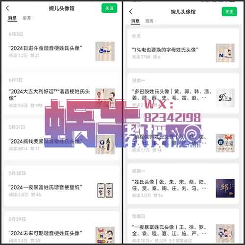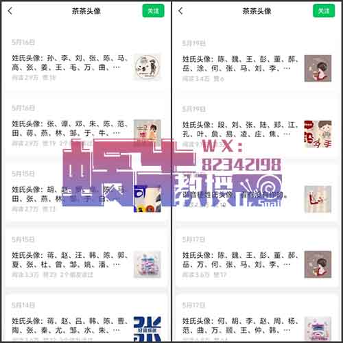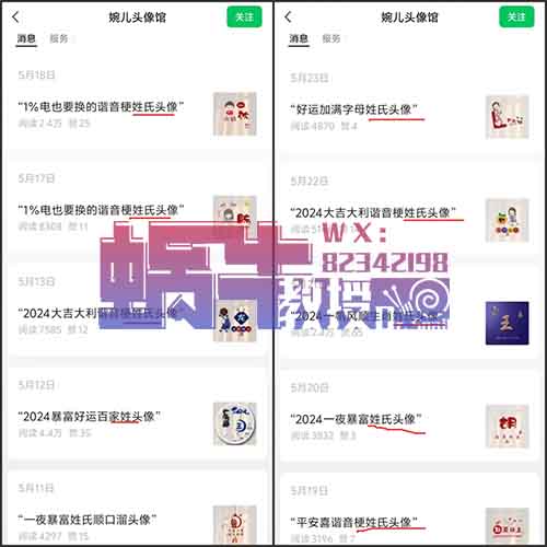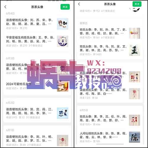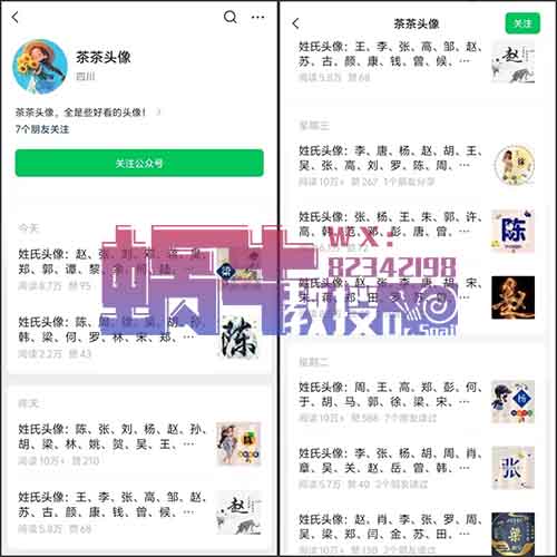 像这样的账号,对标很好找,我们直接在微信搜索:姓氏头像、头像、姓名头像等关键词,可以搜索出来非常多非常多,这些公众号基本都是用文章或者小绿书的方式来发布的,爆一个作品通常收益都会在几百块。