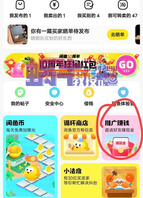 打开闲鱼,点击“我的”,找到“推广赚钱”。