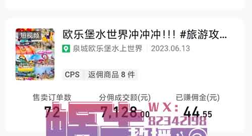 这是去年测的一个图文带水世界门票的作品,1.9万的播放,卖了72单,核销了46单,赚44块钱。其实就是一张拼图,一张攻略图,难吗?很简单,10分钟就能做好。