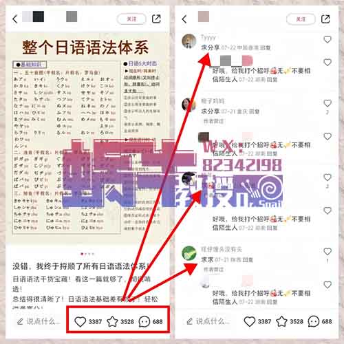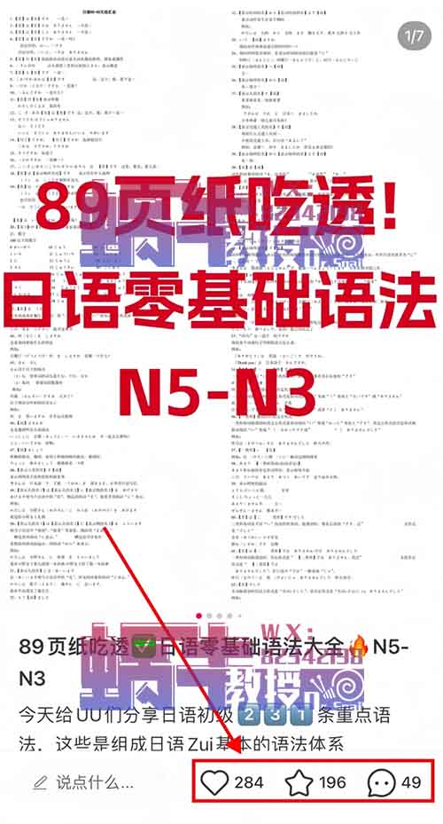 这个项目操作非常简单,也就是小红书发布一些学习日语的资料,通过学习资料吸引客户,引导客户到私域进行转化!