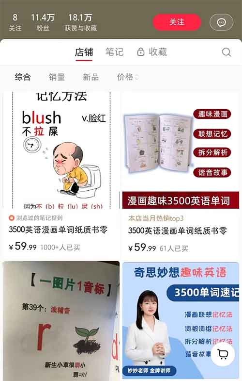 比如说这个账号粉丝量达到了11万,就直接开店铺卖英语单词的教辅书,59.99一单,已经买了1000+,还有高客单的学习课程,199一单,也卖了近500单。