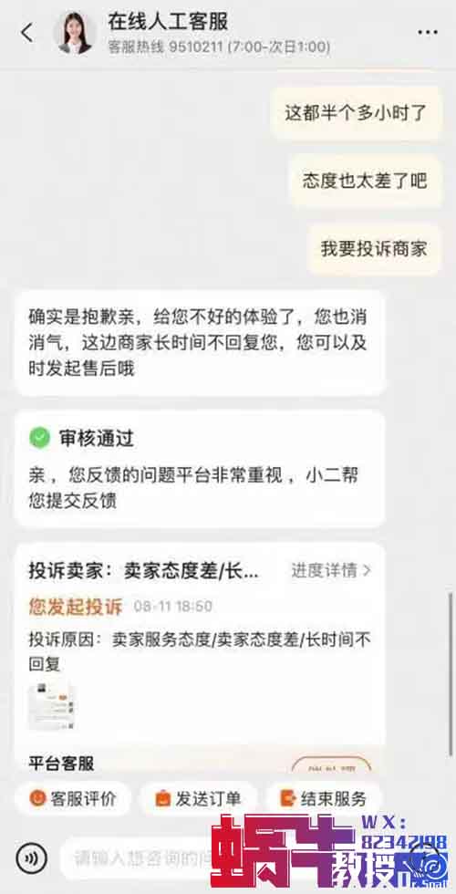 像这种,买了之后去随便给商家发个消息,商家如果过了一小时不回你,那你就可以投诉了,投诉商家消极态度。平台就会给你20RMB