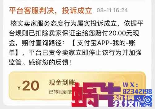 也就是说我们找到无人经营的店铺去下单,然后咨询,商家长时间不回复我们,我们进行投诉会对我们进行赔付一个20元现金