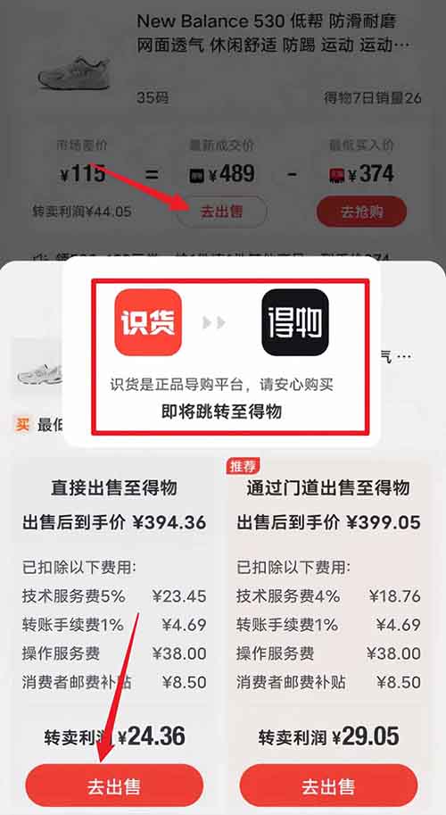 找到自己想要转卖的商品后,点击去出售,选择直接出售至得物,就会自动跳转到得物后台,如下图。