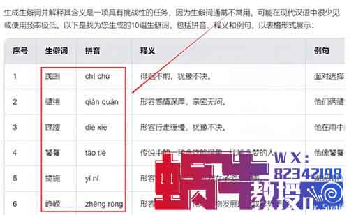 我这里以Kimi为例,直接向它发送一条指令:“以表格的形式帮我生成10组生僻词,并分别标注好拼音和释义”。