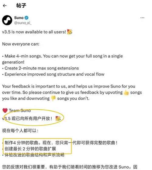 这一消息迅速引发了大家的热烈关注和讨论。记得上个月我还简单介绍过suno的玩法和盈利方式,那时候它还只能生成最长2分钟的音频,且曲调与原作存在差异。