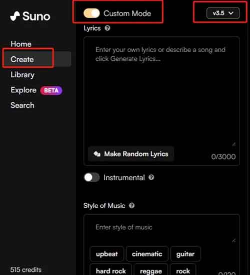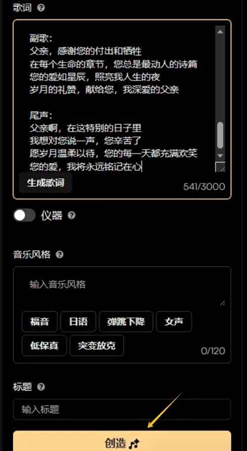 将生成的歌词复制粘贴到suno的歌词框中,并选择你偏好的音乐风格。