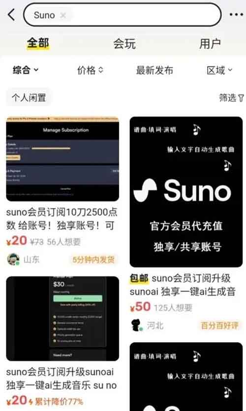 suno账号代充:利用淘宝上suno独立账号代充价格远低于原价的信息差,在小红书或拼多多等平台进行销售,自定价格,每单可赚取十几到二十元的差价。