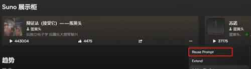 如果你不确定自己想要的音乐风格,可以在suno的首页浏览推荐的歌曲,找到心仪的风格后,点击【reuseprompt】。