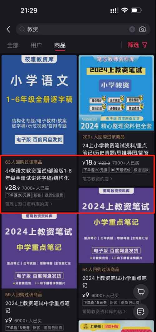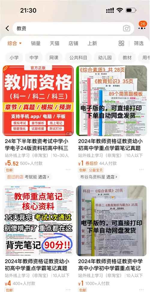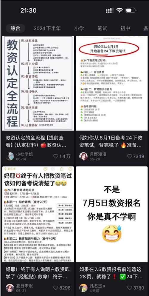 教资资料不仅小红书爆,其实各大平台都火,不管是抖音,视频号,还是b粘,淘宝还是拼多多,上面都有很多人操作,因为这个群体那个群体都多,相对来说小红书用户会比价多,多数是刚毕业,或者是在校要毕业的学生,多数还是女性,成交也相对容易,所以值得研究干一把。
