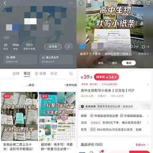再看看第三个案例,这个是一个高中生的案例,主要做的是初高中的生物知识,目前也成交了3966单,全店铺的销量是2835单,一单39元,总共就卖了11w+了,这数据真的太夸张了。