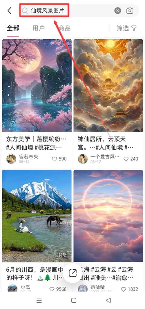 然后,继续搜索关键词“仙境风景图片”,选择3-5张意境优美的图片。