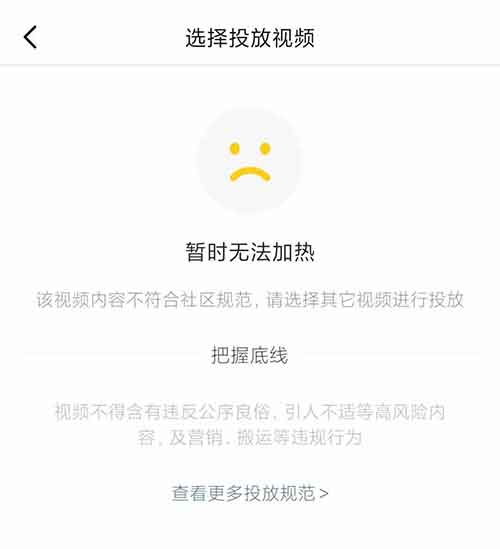 也可以对视频作品投放dou+来检测作品违规情况。如果该视频出现“暂时无法加热”的提示,那就表明出问题了。