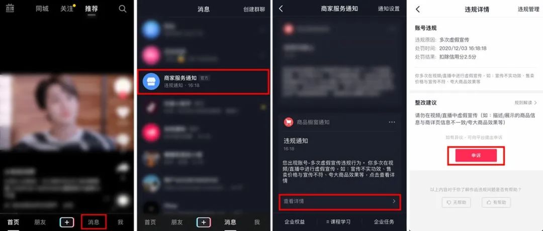 抖音APP首页,点击【消息】按钮——> 找到并点击【商家服务通知】——>找到你的违规判罚通知——>点击通知下方的【查看详情】——>点击【申诉】