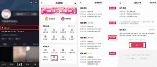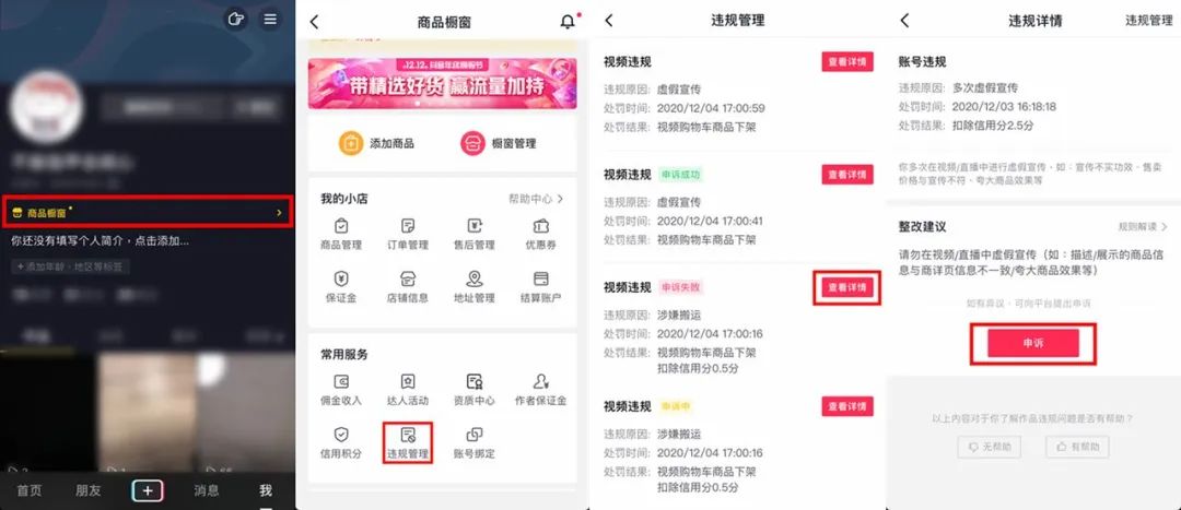 抖音APP首页,点击【我】按钮——>点击【商品橱窗】——>在【常用服务】中找到并点击【违规管理】——>点击违规通知右侧的【查看详情】——>点击【申诉】