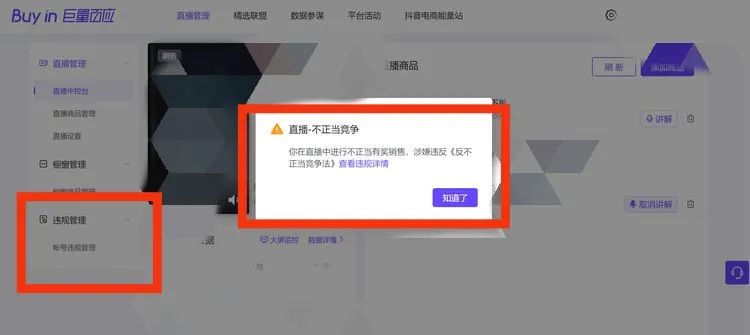 登录后,直播过程中收到的“违规通知”会实时自动以弹窗形式进行提醒,点击“查看违规详情”可了解具体违规原因。