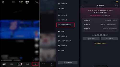 抖音APP首页,点击【我】按钮——>点击右上角【☰】——>进入【创作者服务中心】——>打开【主播中心】——>查看【违规记录】——>点击【申诉】