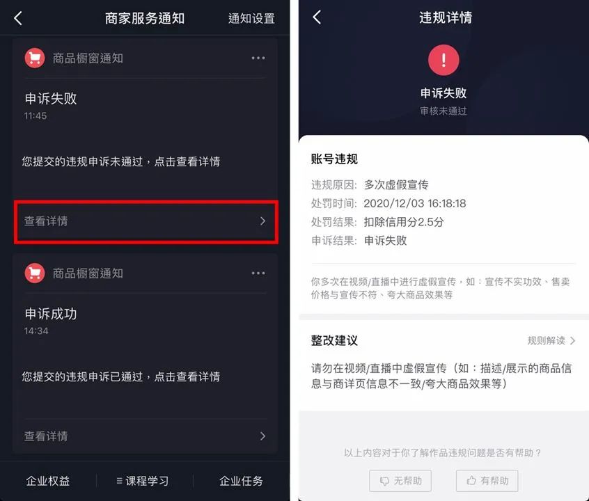 最终提出申诉后,违规判罚通知会显示【申诉状态】。若申诉失败,点击【查看详情】可以查看申诉失败的原因和整改建议。