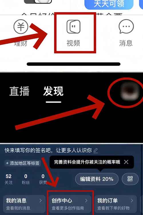 首先,打开支付宝APP,点击底部的“视频”选项,然后点击右上角的头像,进入创作中心。