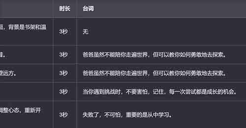 可以看到,表格中的台词就是文案的内容,AI已经通过表格形式帮我们梳理清楚了,方便我们剪辑。