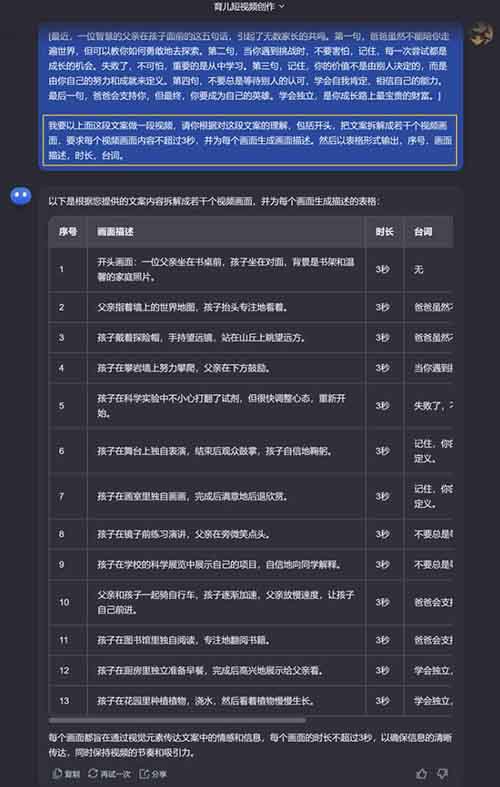 图片素材也是让AI帮我们绘制,老规矩,把指令和文案喂给AI,让AI拆分视频画面并生成图片描述。