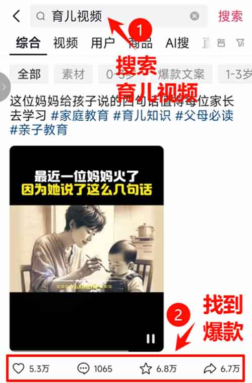 以抖音为例,在抖音搜索关键词“育儿视频”,筛选近一周内点赞最高的视频,复制视频链接。