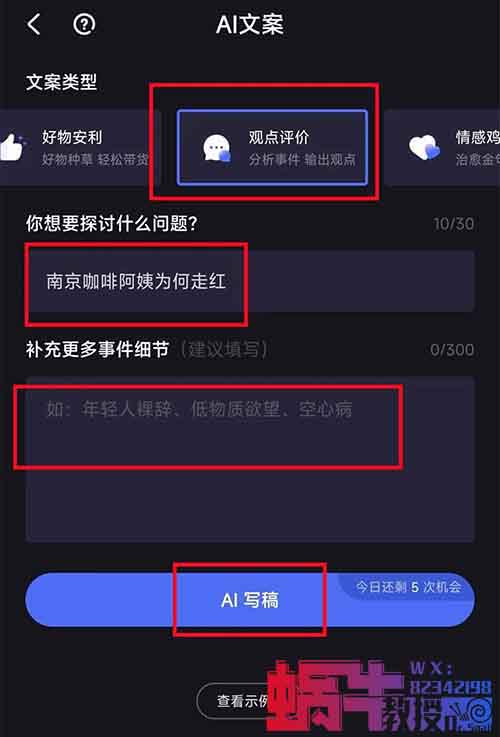 把你刚找的热点选题填写进来,文案类型选择观点点评补充更多事件细节,最后点击AI写稿。