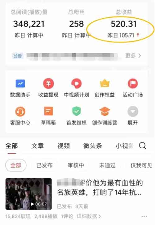 正因为抗日题材电视剧广受欢迎,利用这些剧进行二次创作、加上解说来制作短视频,成了一个不错的创作赛道。这个项目操作简单、素材丰富,只要稍微加工,就能通过发布短视频获得不错的流量分成。