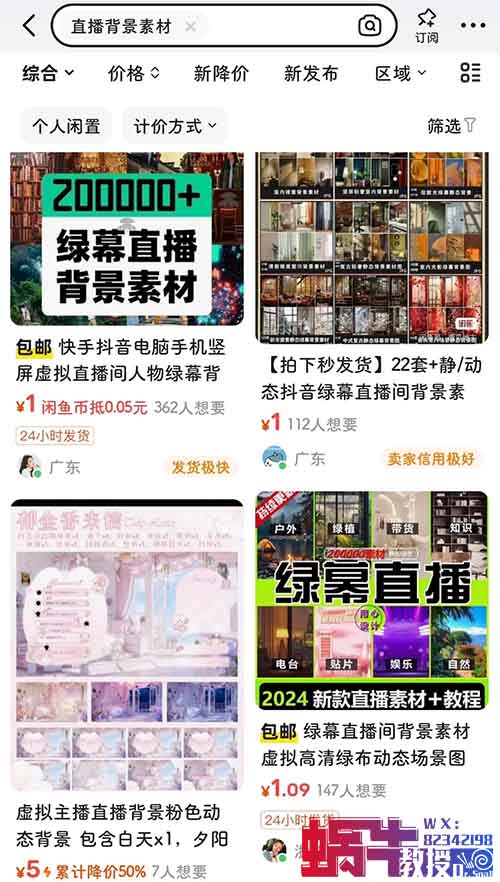 这就是商机,我们可以将这些直播背景素材上传到二手交易平台,为那些需要的人提供服务,同样也能赚到钱。