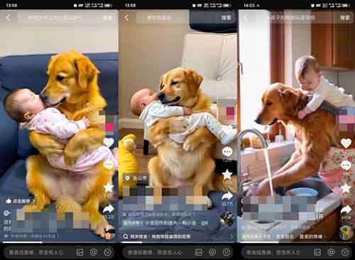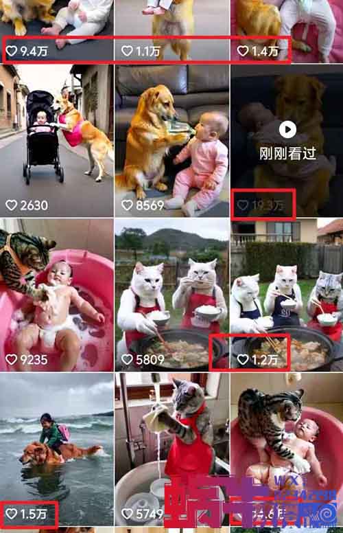 如果没刷到过的可以去搜索宠物带娃,就可以搜索出来很多这种作品。