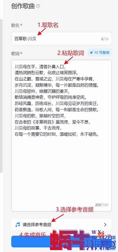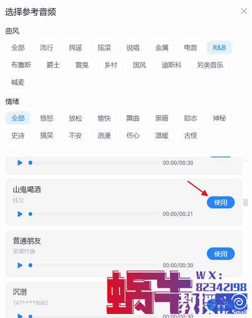 将刚才word里处理好的文案粘贴过来,取上歌名,重要的是选择参考音频,由于抖音是快节奏的,我们选择参考曲风时可以选择说唱、R&B之类快节奏或者比较魔性节奏的歌曲,这样完播率才高。