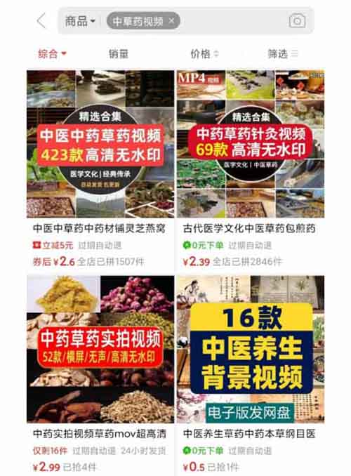 生成了文案,变成了歌曲,我们还需要用中药百草的视频素材来混剪,毕竟唱的是川贝母,视频里播的是决明子,是不行的。要解决视频素材找拼多多、淘宝就行了,几块钱的事。