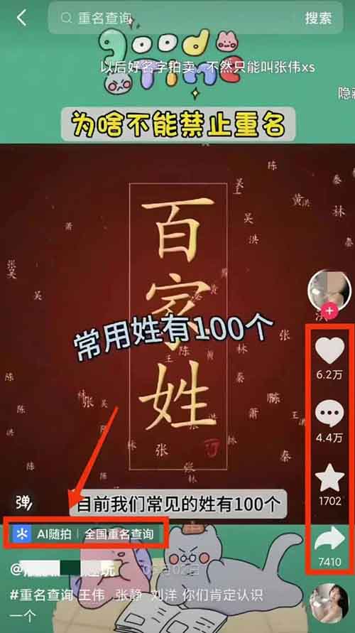 如果你平时喜欢刷短视频,应该见过类似的视频,左下角挂有“全国重名查询”这种小程序链接。实际上,这些就是创作猫的变现任务,只要有人点击并使用小程序,你就能获得相应的收益。