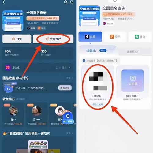 比如你可以找到一个“全国重名查询”小程序,点击“立即推广”,选择挂载推广并选择适合自己的推广方式,就可以开始操作了。