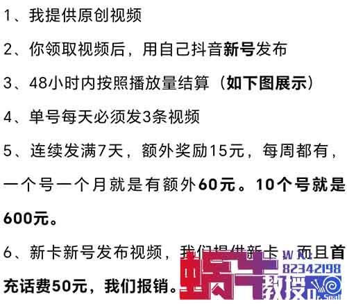 他们带的这个项目操作很简单,每天发三个他们提供的视频,48小时以后按播放量结算,而且坚持每天发还有额外奖励。