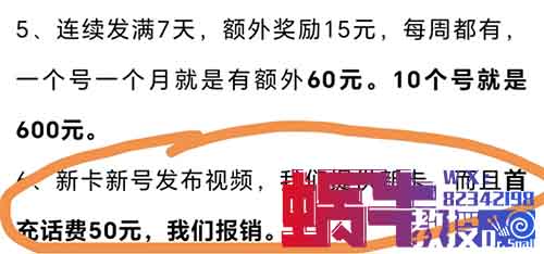 第六条,这是重点,要新卡新号发布,他们提供新卡,而且首冲话费给你报销50元!老鸟看到这已经明白了,他们是怎么赚这个钱的?