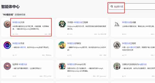 然后我们搜索“MJ提示词”,选择在搜索结果中出来的热度最高的智能体,点击进入智能体对话页面。