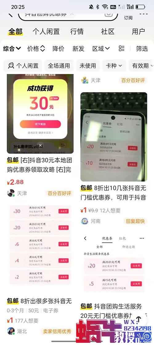 优惠券拿到之后可以在闲鱼挂出卖掉,一般都是八九折出售,30的优惠券能卖24左右,别人拍了优惠券之后你再代别人在抖音下单即可